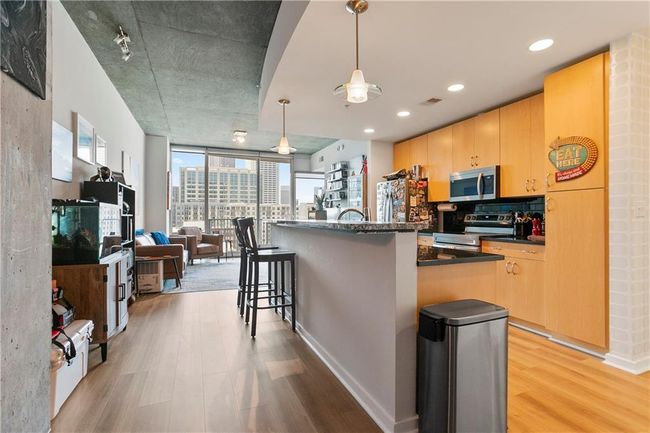 Showing by appointments only with 24 hours heads up notice. The largest 1 bedroom 1 bathroom floor plan in SPIRE Midtown approximate 877 sqft with beautiful unobstructed city views from the floor to ceiling windows of family room and bedroom. Open floor plan, 10' exposed concreted ceilings, updated Luxury Vinyl Plank flooring, entrance desk space, windows with roller shades, kitchen island with granite countertop/breakfast bar, tiled backsplash, dining area, spacious living room, large bedroom, huge walk-in closet, newer washer/full size dryer, newly painted interior, tiled bathroom, large vanity with lots of counter space and storage, and a new water heater installed in August 2020. 24 Hour Concierge, resort style amenities include: Swimming Pool, Fitness Center, Club Room & Media Room. Walk to Over 90 Restaurants, MARTA, Piedmont Park, Publix, Whole Foods, Beltline, High Museum & The Fox Theater. Unit comes with 1 indoor parking space. Enter building through main entrance on Peachtree Street.