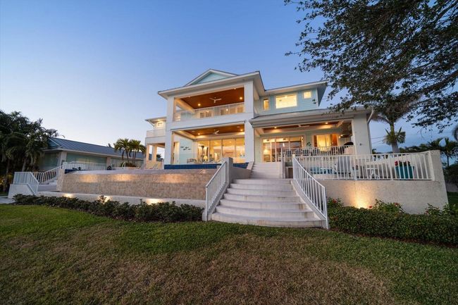 This one-of-a-kind waterfront paradise is perfectly situated on a triple lot. This home offers breathtaking southerly panoramic views of the elevated infinity-edge pool out to the expansive bay. A true boater's paradise, the property features a custom dock updated in 2020 with a 20, 000-lb lift in a protected cove great for wakeboarding, fishing, and paddle boarding. This location provides quick and easy access to the Intracoastal Waterway, Clearwater Pass, and the Gulf of Mexico. Inside this custom-built masterpiece, luxurious interiors and meticulous craftsmanship define every space. Upon entering, you are greeted by soaring 12-foot ceilings and sweeping southerly views that immerse the home in natural light. The main living area is an entertainer's dream, showcasing 10-foot hurricane-rated sliding glass doors that seamlessly open to a spacious balcony perfect for enjoying sunsets and hosting gatherings. Custom built-ins and a gas fireplace add elevated elegance, creating a warm yet sophisticated ambiance. The chef-inspired kitchen is a culinary haven, featuring a large island, custom cabinetry, granite countertops, and premium appliances. This space combines style and functionality, making it ideal for everyday living and entertaining. This level also features a bedroom and pool bath. The bedroom features stunning views and access to the pool. The pool bath features a glass-enclosed shower with custom cabinets and quartz countertops. The third floor is dedicated to relaxation, with a luxurious primary retreat that includes a walk-in custom closet, and a private balcony overlooking the water. The spa-like primary bath is bathed in natural light, offering stunning views from every angle. The bath boasts a dual custom vanity and a glass-enclosed shower with a separate soaking tub. Three additional spacious bedrooms boast picturesque southerly views, ensuring comfort and privacy for family and guests. Two bedrooms feature full baths and the 3rd bedroom/office has a half bath. The laundry closet is located on this level with an additional laundry room on the second level. The outdoor spaces are spectacular — the elevated infinity pool, fire pit, outdoor kitchen, and grilling area are all set against the backdrop of a beautifully paved pool deck, creating the ultimate outdoor oasis. This exceptional home offers a unique 2, 000-square-foot air-conditioned 6-car garage and a massive 44X14 carport designed to accommodate an RV, providing ample storage and convenience. The beautifully landscaped gardens and custom paver driveway enhance its curb appeal, while its elevated block construction ensures durability and significant protection against hurricanes. For added security and peace of mind, the property is equipped with custom hurricane impact glass, sunshades, a top-of-the-line Generac generator, and two tankless gas water heaters. Both are capable of servicing the entire home. Experience a lifestyle of unparalleled luxury, privacy, and tranquility in this remarkable waterfront residence. Schedule a private showing today.