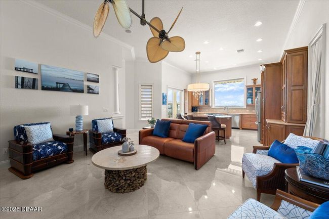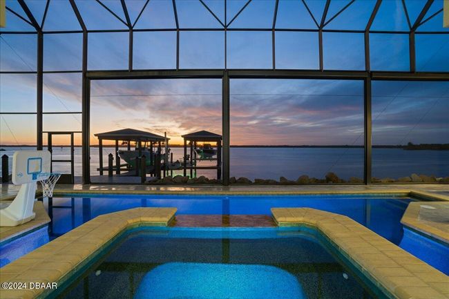 Experience the pinnacle of luxury living in this magnificent waterfront estate on Ormond Beach's most esteemed street, John Anderson just a couple blocks from the beach, where elegance meets comfort at every turn. Boasting panoramic views of the Intracoastal and Tomoka Basin, this extraordinary riverfront residence is a haven for those who cherish fishing, sunset vistas, and local wildlife. Impeccably renovated, the home features four spacious bedrooms and four and a half baths, each offering sweeping water views and refined style. Upon entering, you're met with an inviting ambiance accented by stunning new marble floors throughout the main living areas. The gourmet kitchen is a culinary delight, featuring granite countertops, an oversized breakfast bar, and generous space for hosting friends and family. Enjoy privacy for guests in a dedicated suite tucked away in the south wing, while upstairs offers three additional bedrooms, a grand family room, and a flexible space ready to suit you unique vision. Retreat to the owner's suite, complete with a spa-inspired walk-in shower, dual vanities, and a private balcony overlooking tranquil waters. Outdoors, unwind in your solar-heated saltwater pool and spa, protected by automatic retractable screens and surrounded by elegant travertine decking. Established in 2022, the custom dock offers two boat houses and a jet ski lift for effortless river access, complemented by a newly built coquina seawall added in 2024. This smart home embraces modern technology, featuring advanced security systems with cameras and remote control, motorized window shades, automated awnings, Lutron lighting, and Hayward Omnilogic pool and spa management. The pristine garage, equipped with Martin epoxy floors and an electric bike lift, demonstrates meticulous attention to detail. Energy-saving open-cell foam insulation in the attic boosts efficiency, while lush, mature landscaping truly sets this property apart. Every inch of this home radiates pride of ownership, schedule your private tour today and discover a waterfront masterpiece in one of Ormond Beach's most coveted beachside areas.