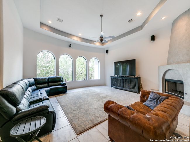 A beautiful one story home nestled in the exclusive gated community of Fossil Ridge in Cibolo Canyons. Conveniently located off 281 and TPC, a short drive from shopping and dining, and just down the street from Johnson High School. This beautiful custom home sits on a 1.29 acre lot surrounded by mature trees and natural landscaping, offering privacy and shade. Private entryway patio offers a built in gas grill, wet bar, and kitchen space. High ceilings are featured throughout the home. The living room features surround sound speaker hookups, views of the covered outdoor patio, and a gas fireplace. The modern kitchen features plenty of storage and cabinet space, dry bar area, an island with built in storage, stacked oven and microwave appliances, custom designed vent hood over the gas range, and spacious bar seating. Luxurious counter tops throughout the kitchen. The dining area features custom built in storage/buffet and views of the gorgeous back yard and covered patio. The Primary Bedroom features views of the backyard with a very spacious Primary bathroom, complete with his and hers vanities, soaker tub, walk-in steamer shower, and balcony access. The newly updated walk-in shower is generously sized and offers built in storage. The walk in closets features plenty of custom modern built in storage to effortlessly organize and store items. The large laundry area hosts storage and a utility sink easily making this a utility or storage area. The second bedroom is not only spacious and welcoming of natural light, it boasts custom built in storage and entertainment center. This room is joined with a Jack & Jill restroom to the third bedroom. The third bedroom is very spacious and has a large closet. The Jack and Jill is a full bath with tub and shower combo, toilet room separate, complete with plenty of storage within the vanity and a separate linen storage. Bath has updated removable shower head. This home features a port for pest control injection treatment, outdoor speakers, and boasts a roomy outdoor covered patio with fans. The backyard highlights the natural landscape with a fire pit area and endless possibilities for entertaining or enjoying quiet time secluded in the scenery. The two-car garage hosts plenty of workshop space with an accent flooring. On the private driveway there is space to park multiple vehicles. Make this exclusive and luxurious home yours today!