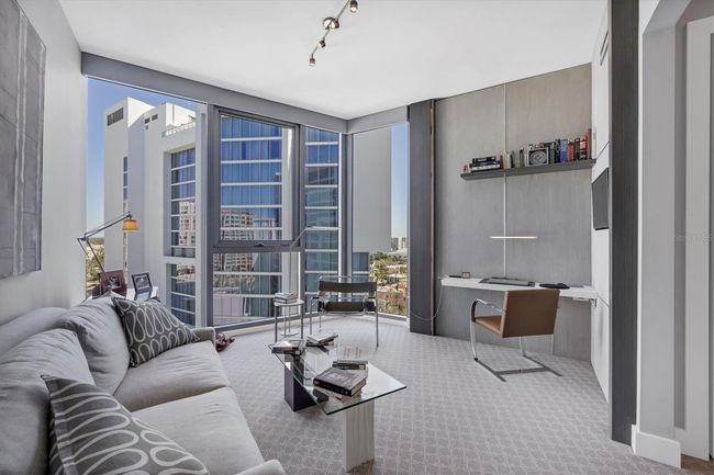 A private residence at The Vue is an entrée to the extraordinary waterfront lifestyle of downtown Sarasota. The inspiring vistas from this exquisite, updated condominium are equally matched by the subtle sophistication of its contemporary interior style and design. From your private elevator foyer, you are immediately welcome to a fabulous view. The generous great room is filled with natural light from the floor-to-ceiling glass and open to a full-length balcony 48’ x 10’. Beautiful wood floors throughout, except for the 2 back bedrooms, the gourmet kitchen features a large island with quartz countertops, induction cooktop, European white cabinetry, beautiful backsplash, and lots of storage. A custom “cloud” ceiling and a wall unit, designed by a local artist, add a unique touch of elegance in the living room. The primary bedroom has this incredible view, a luxurious bathroom, and 2 walk-in closets. The study/den is equipped with a wine refrigerator, a dry bar, and a matching piece of furniture that is included along with the mounted TV. The other 2 bedrooms have floor-to-ceiling glass as well, walk-in closets, and 2 full baths. The Vue offers private amenities including a valet parking, 24 hour concierge service, a state-of-the-art fitness center, club lounge an engaging sitting area to host friends and guests, a board room for private meetings and functions. Under building parking, secure climate control storage, professional on-site management staff are on hand to provide thoughtful services. Prime downtown location adjacent to the Westin Sarasota and the Ritz Carlton hotels. Short driving distance to Lido Beach, St. Armands Circle, and Sarasota airport.